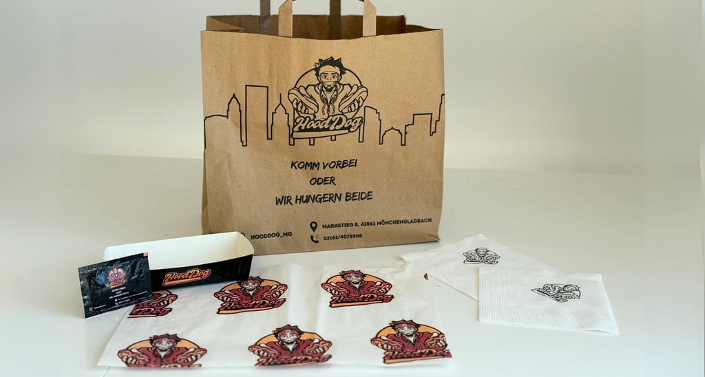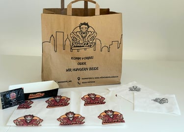 Ob Speisekarten, Aufkleber, Tragetaschen oder gebrandete Verpackungen – wir achten auf jedes Detail, das dein Geschäft sichtbar und merkbar macht.